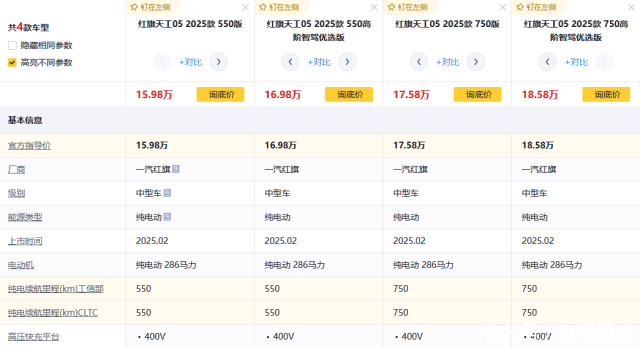 红旗天工05是一款轴距为2900mm的中型纯电车,目前有4个版本在售,官方价格指导区间从15.98万元至18.58万元不等,定价远低于同级热销的特斯拉Model 3,有效拉低人们的入门门槛。新车采用的电池容量有62kWh和85kWh两个段位,对应的CLTC纯电续航里程为550km和750km,充电条件便利且用车环境单一的话,选择短续航版就足够用了,长续航版更适合容易产生里程焦虑或对价格不敏感的用户。